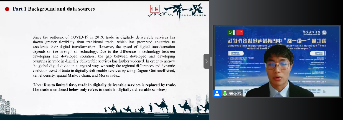 “一帶一路”青年論壇環(huán)節(jié)由我校國(guó)際經(jīng)管學(xué)院數(shù)字經(jīng)濟(jì)系副主任韓璐主持。由我校經(jīng)濟(jì)學(xué)院國(guó)際貿(mào)易系主任郭志超、國(guó)際經(jīng)管學(xué)院數(shù)字經(jīng)濟(jì)系副主任張璐,廣東外語(yǔ)外貿(mào)大學(xué)經(jīng)濟(jì)貿(mào)易學(xué)院副教授、高被引學(xué)者丹尼斯、寶雞文理學(xué)院副教授穆罕穆德 ? 阿韋斯 ? 俾路支、巴基斯坦費(fèi)薩拉巴德政府學(xué)院助理教授穆罕穆德 ? 瓦薩姆 ? 巴里等擔(dān)任專家委員會(huì)成員。10位國(guó)內(nèi)外學(xué)生就“一帶一路”國(guó)際合作主題展示了自己的研究成果。專家委員會(huì)對(duì)論文進(jìn)行了點(diǎn)評(píng)及打分,最終評(píng)選出一等獎(jiǎng)1名,二等獎(jiǎng)2名,三等獎(jiǎng)7名。專家委員會(huì)鼓勵(lì)中巴青年積極開(kāi)展各領(lǐng)域交流合作,增進(jìn)友誼。
