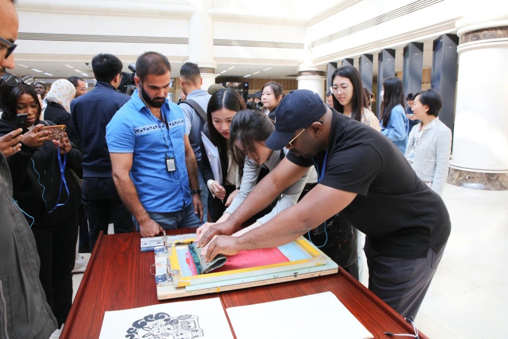 在圖書館大廳,記者們參加了“絲網印刷”文化體驗活動。傳媒與設計學院品牌設計方向的研究生將中國傳統經典圖形圖案及北京經典文化符號,以當代青年人的視角進行設計再創作,并與絲網印刷革新刷技術手段相結合,邀請記者們共同創作兼具古今文化藝術韻味的絲網版畫作品。當大家看到自己制作的成果時,都紛紛感嘆絲網印刷的神奇和中國傳統文化的魅力。