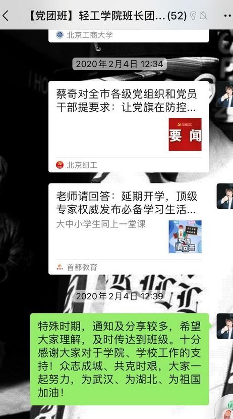 藝術與傳媒學院輔導員徐亮是湖北人。疫情發生后,徐亮老師沒有退縮,而是勇挑重擔,經學校黨委批準,徐亮老師擔任由28名在鄂師生黨員組成的湖北師生臨時黨支部書記。面對這項光榮而艱巨的任務,徐亮老師第一時間動員支部成員,發揮支部戰斗堡壘作用,發布在鄂師生倡議書,提醒每日健康通報,征集抗疫文藝作品。同時,徐老師面向在鄂142名師生進行線上問卷調查,梳理在鄂師生現狀、困難、建議,整理網課學習情況,及時反饋學校。在徐老師的帶動下,黨支部的28名黨員活躍在北工商在鄂本科生群、研究生群、湖北學生家長群,在各項工作中發揮著重要作用。