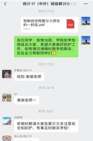 遠赴重洋求學的64名學子,雖不在國內,但他們仍舊被數學與統計學院輔導員李鑫掛念。李老師主動通過微信、QQ等方式與他們保持“點對點”聯系,及時掌握學生動態,確保信息上報無“死角”。他在海外學子最焦慮的時刻,用一條條疫情的通報、一句句暖心的問候、一串串溫暖的字符,疏導著焦慮,安撫著情緒,傳遞著信心。在了解到學生無法在愛爾蘭購買到防護口罩的情況后,李老師多方聯系,成功為學生配齊口罩并于近期寄往愛爾蘭,用實際行動守護學生的健康與安全。