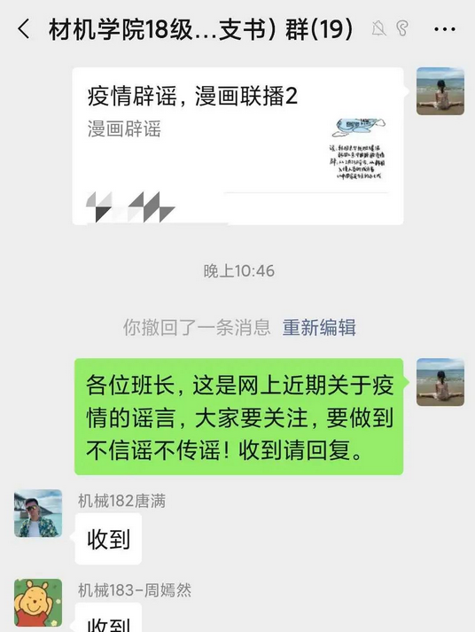 當“搶購雙黃連”、“喝酒抗病毒”、“環保酵素抑菌殺毒”等謠言不時出現,材料與機械工程學院輔導員鄧浩為避免學生輕信上當,及時查閱資料,收集官方信息,不間斷在朋友圈、微信群宣傳最新防控知識。同時,鄧老師動員團學骨干開展“粉碎抗疫謠言”工作,主動破除網絡謠言,引導學生不造謠、不信謠、不傳謠,做好一名抗“疫”網絡安全知識的宣傳員。