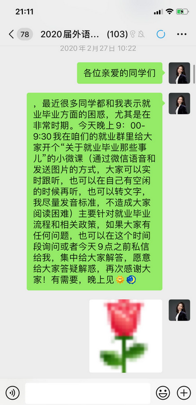 疫情當前,每名大四學生的就業都牽動著外國語學院輔導員張悅的心。她圍繞“云就業”開展工作。每天花費大量時間搜集招聘信息,將最優質的崗位招聘發給畢業生,鼓勵學生認真準備,以最良好的精神面貌迎接招聘單位。同時,張老師認真開展就業指導,細心解答同學們最關注的考研復試、出國留學、自主創業等問題,為學生一對一辦理就業生推薦表、三方協議等就業手續。