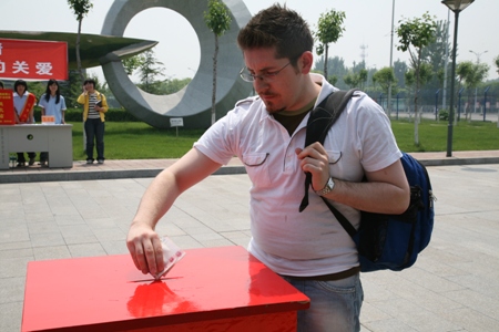 外籍老師戴子.蘇利文也在捐款箱前停住了腳步捐出了300元錢