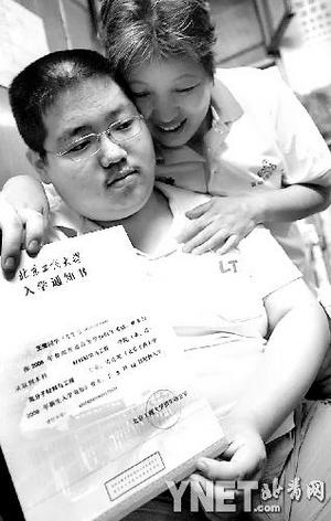 本報(bào)記者報(bào)道 收到大學(xué)錄取通知書(shū),18歲的男孩王瑩喜憂參半:喜的是經(jīng)過(guò)努力以學(xué)校理科第一名的優(yōu)異成績(jī)被北京工商大學(xué)錄取了;憂的是他很擔(dān)心因?yàn)樯眢w原因被大學(xué)拒收。王瑩說(shuō),他懇請(qǐng)學(xué)校能給一次上學(xué)的機(jī)會(huì),將來(lái)要自食其力并回報(bào)那些曾經(jīng)給予自己幫助的好心人。