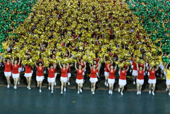 青春的節奏,讓朝氣蓬勃的大學生伴隨著樂聲在運動場上綻放出最美的年華。來自商學院、經濟學院、藝術與傳媒學院、計信學院以及材機學院的1008名大一女生踏著歡快的啦啦操歌曲驚現“舞臺”。她們身著紅色和黃色制服,高舉手花,用各式各樣的隊形淋漓盡致地展現著“巾幗不讓須眉”的氣魄。長久的期盼在此刻化作了自信的笑容洋溢在每一位同學的臉上,她們用年輕人的青春蓬勃繪出了一幅又一幅壯美的畫卷:“小飛機”、“2013”、“花團錦簇”不斷地展現在觀眾的視野中。指導教師王立紅說,團體操的訓練讓同學們都參與到了體育鍛煉中,看到大家這樣辛苦訓練的成果在此刻展現,我們真正做到了為自己加油。