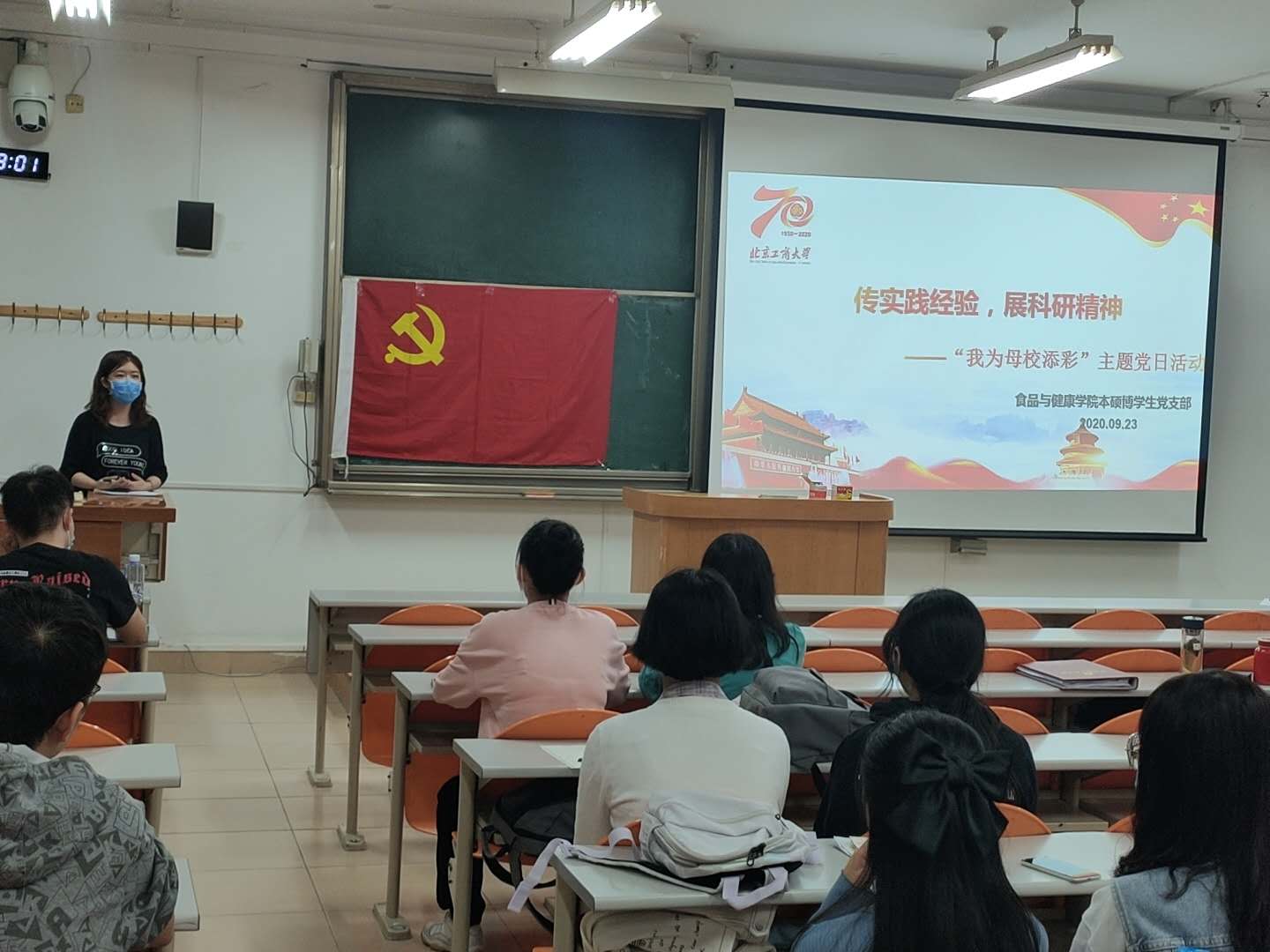 9月23日晚,食品與健康學院本碩博各學生黨支部聯合開展了以“傳實踐經驗,展科研精神——我為母校添彩”為主題的黨日活動。此次活動由食品科學與工程本科生黨支部書記李欣萍主持。