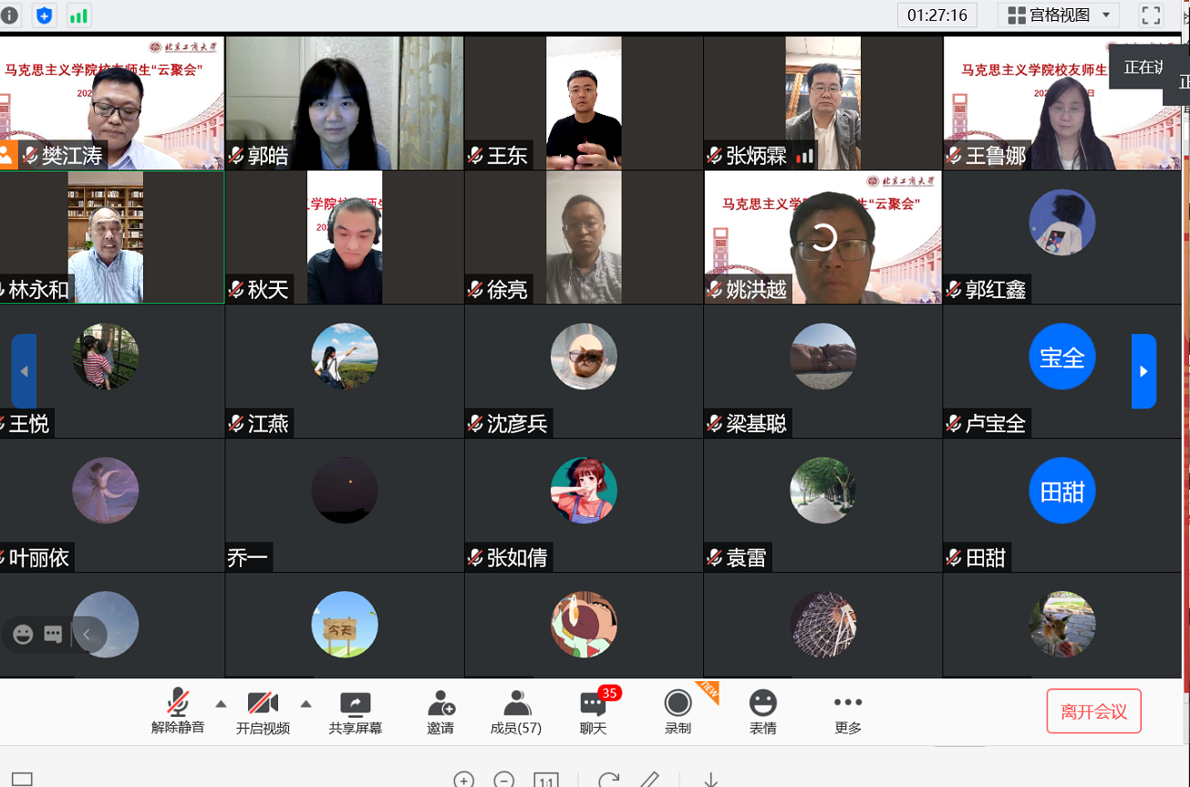 活動中還展示了北京工商大學(xué)校歌和馬克思主義學(xué)院院徽,校友師生線上共唱校歌,在雄壯的校歌聲中,“云聚會”圓滿結(jié)束,校友們紛紛線上留言,祝福母校發(fā)展壯大,祝福老師桃李滿天下。