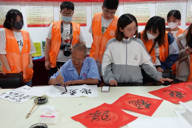 實踐期間,同學們走進村委會,與原村支部書記張寶珠老爺爺進行書法交流。正襟威坐,一個筆酣墨飽的“?!白滞瓿闪?,雖然張爺爺已是耄耋之年,但他的筆法依舊蒼勁有力,他的思想與精神依舊躍然紙上。精神所在,就是血脈所在、力量所在,就是信念所在、希望所在。在書法交流的過程中,張爺爺根據實踐團成員幾天以來的調研,在宣紙上寫下”忠勇篤行 勤耕樂學“八個大字,字字鏗鏘,這是他對阜高營村風民風的總結,更是對青年一代的期許,是青春的承接,亦是使命的傳遞。同學們牢記教誨,幾天里用腳步丈量土地,用心去感悟紅色精神,用筆書寫新時代新農村的點點滴滴,用行動與這個時代同頻共振。