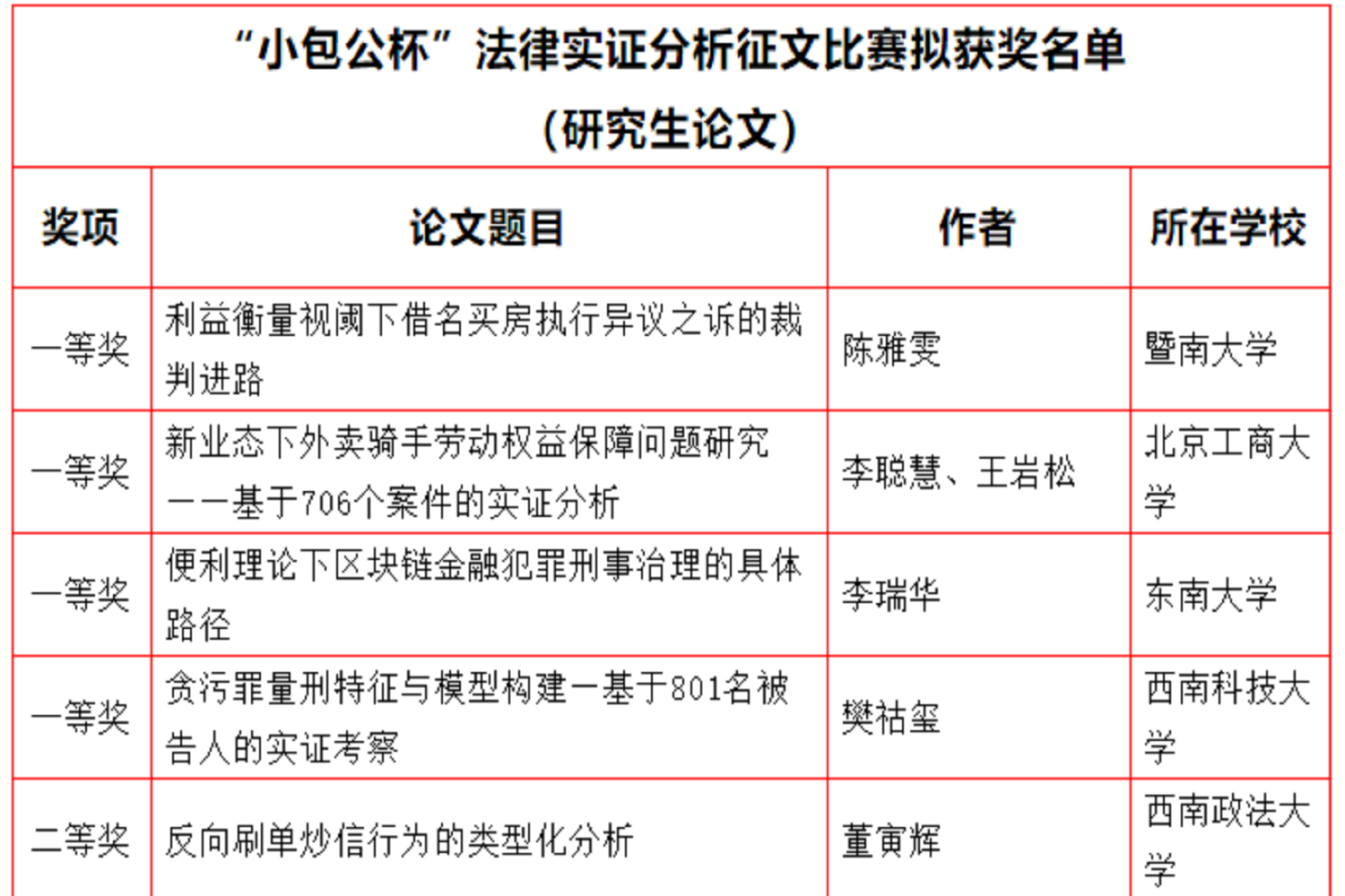 為努力培養具有創新精神和實踐能力的法學高級專門人才,9月10日,由廣東省法學會主辦,廣東省法學會信息通信法學研究會、華南師范大學法學院承辦的首屆“小包公杯”粵港澳大學生法律實證分析征文比賽在廣州舉辦。我校法學院研究生獲得一、二、三等獎各一項,取得優異成績。