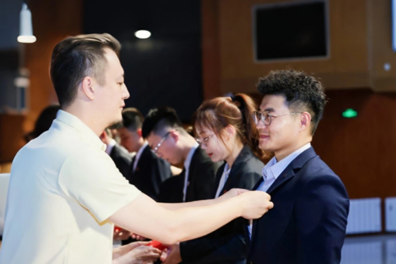 商學(xué)院領(lǐng)導(dǎo)為新生代表佩戴院徽,愿每一位新商院學(xué)子心中裝滿對國家的深情厚意,接續(xù)前輩的奮斗之火,砥礪前行,無畏挑戰(zhàn),勇攀科學(xué)與知識的巍峨高峰。