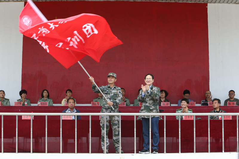 在雄偉洪亮的軍歌之后,張德玉副書記宣布成立2016級(jí)學(xué)生軍訓(xùn)團(tuán)的決定。在熱烈的掌聲中,學(xué)校黨委書記譚向勇向軍訓(xùn)團(tuán)團(tuán)長(zhǎng)徐建云授團(tuán)旗。團(tuán)長(zhǎng)徐建云向各營授營旗。