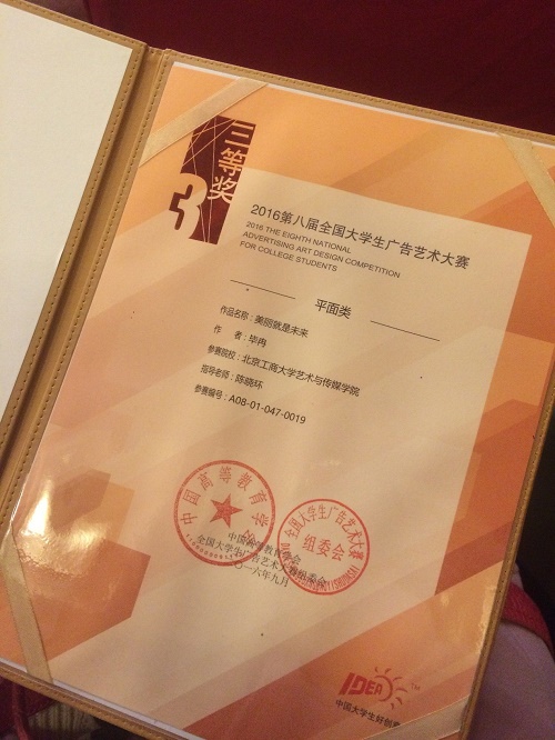 日前,第八屆全國大學生廣告藝術大賽全國總決賽獲獎作品名單公示,藝術與傳媒學院視傳141班畢冉同學的作品《美麗就是未來》榮獲平面類三等獎,另有18名同學喜獲國家級優秀獎。該作品指導老師陳曉環和獲獎作者畢冉同學應邀出席了在全國政協禮堂舉辦的頒獎典禮。