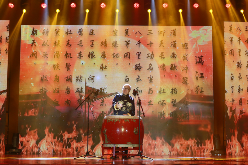 年過八旬的著名朗誦藝術家殷之光精神抖擻,他揮動雙臂,用自己獨創的擊鼓配樂的方式朗誦表演了岳飛的《滿江紅》、文天祥的《過零丁洋》,將誦讀會推向高潮。大家跟隨名篇一起誦讀,激昂的詩句點燃聽眾的激情,場上響起了經久不息的掌聲。