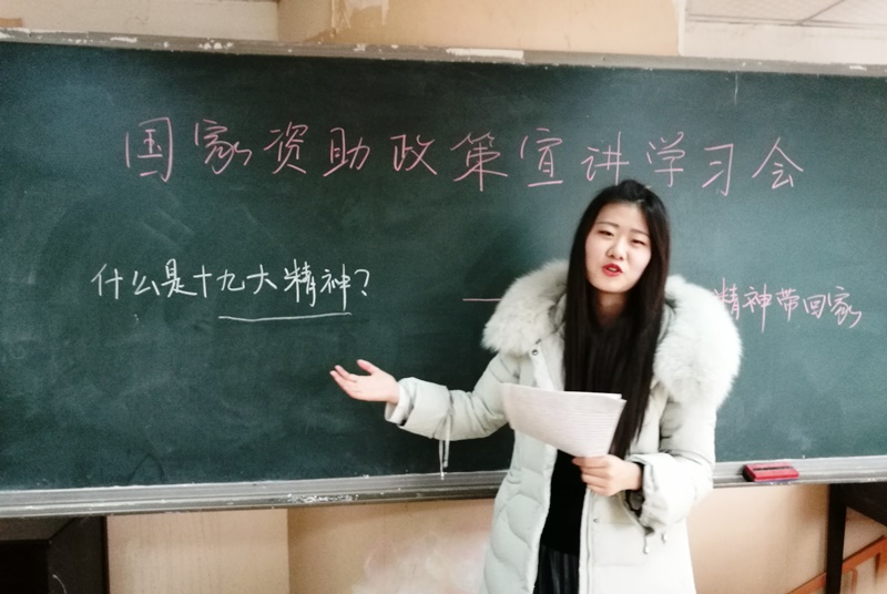 寒假前夕,學(xué)校從2016-2017學(xué)年國家獎學(xué)金、國家勵志獎學(xué)金獲得者中選拔20名品學(xué)兼優(yōu)并有強(qiáng)烈志愿服務(wù)愿望的學(xué)生聘任為“學(xué)生資助宣傳大使”。他們利用寒假返鄉(xiāng)的機(jī)會,到高中母校、當(dāng)?shù)剞r(nóng)村、社區(qū)宣傳介紹國家資助政策以及自己如何在好政策的幫助下安心學(xué)習(xí)、成長成才的勵志故事,并結(jié)合十九大勝利召開的契機(jī),開展“我把十九大精神帶回家”宣講實(shí)踐活動,以感恩之心回報(bào)國家關(guān)愛,力所能及地為家鄉(xiāng)發(fā)展、為鄉(xiāng)村振興做貢獻(xiàn)。