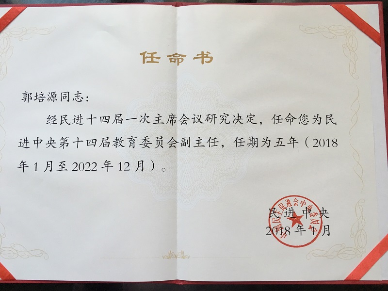郭培源教授作為民進會員,積極服務社會,始終如一地關注國家、北京市、學校的教育改革發展,認真履行職責,積極參政議政,2016年被評為“民進全國參政議政先進個人”。