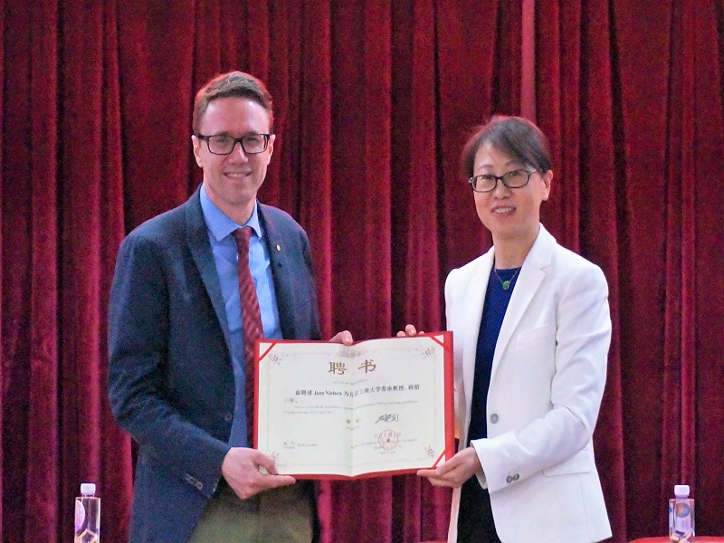 王鳳寰對Nielsen教授在化學與生物工程方面的突出成績作了詳細介紹,并希望Nielsen教授能為我校教學和科研提供強有力的支持。Nielsen教授對我校師生的歡迎報以感謝,并表示本次能來到我校非常榮幸,愿意為我校的發展做出貢獻。隨后,何猛代表學校為Nielsen教授頒發聘書,Jens Nielsen教授正式受聘成為我校客座教授。