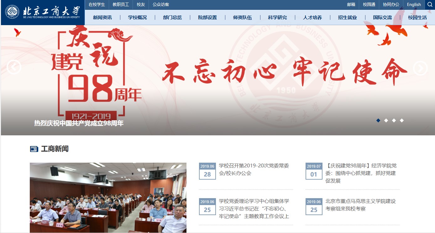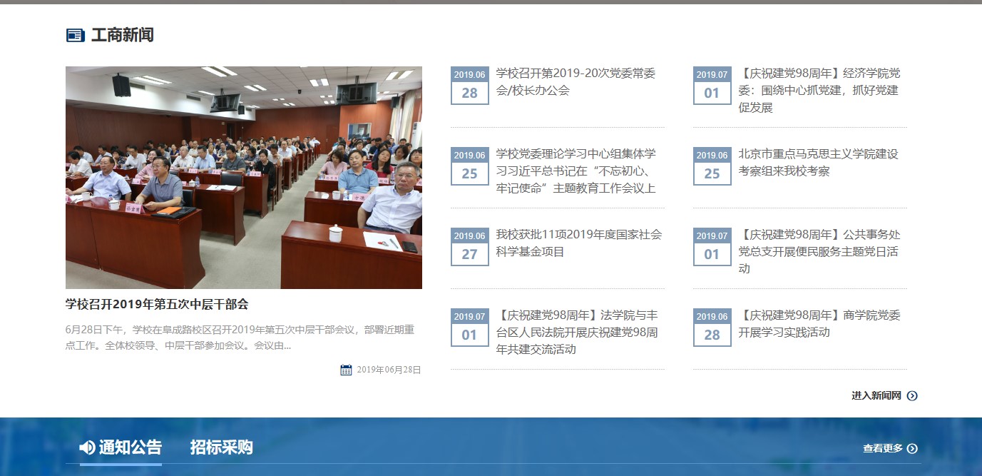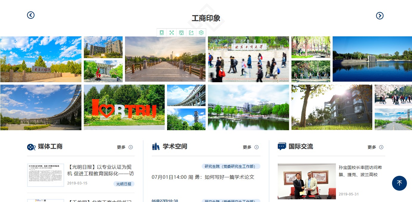 改版前對原版校園網進行了梳理分析,調研、參考了80多家國內外高校校園網的版面設計、欄目設置和頁面內容,進一步明確了校園網的功能、定位。新版校園網立足對外展示形象、對內服務師生,力求通過改版,以達到使用更便捷、架構更清晰、頁面更時尚的改版目標,進一步服務學校中心工作和師生需求。新版主頁以工商藍為主色調,采用寬幅版式,構圖具有鮮明的視覺沖擊效果。新版網頁主要變化有:第一,更新主頁面的結構,采用扁平化首頁高清主題圖片滾動展示重要節點、學校重要新聞事件、校園風景等內容,增加“工商印象”版塊,用大篇幅圖片展現學校優美風景,提升首頁整體美觀度,同時,將頁面增加至5.5屏,增加了信息的顯示量。第二,優化欄目設置與欄目顯示。為增強新聞可讀性,改變綜合新聞簡單標題的陳列方式,改為1篇帶圖新聞、8篇新聞標題陳列方式,形式更美觀、更清晰;為展現我校國際化成果,提升學校國際化水平,增加了“國際交流的版塊;為方便師生讀取信息,在“通知公告”“學術空間”“招標采購”欄目中增加來源部門及發布時間顯示;在首頁顯示各學院,使用戶可以通過首頁直達學院網站等。