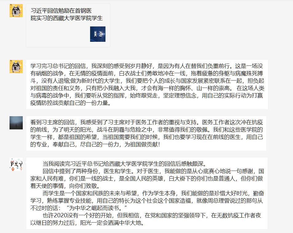 學(xué)院組織各個(gè)團(tuán)支部采取線上討論和線下自學(xué)的方式進(jìn)行學(xué)習(xí),并將同學(xué)們的學(xué)習(xí)情況進(jìn)行了總結(jié)。通過(guò)這段時(shí)間對(duì)于新聞要事的關(guān)注,同學(xué)們了解到如今有17名西藏大學(xué)醫(yī)學(xué)院同學(xué)在北京進(jìn)行臨床實(shí)習(xí),既鍛煉了臨床基本功,也堅(jiān)定了獻(xiàn)身西藏醫(yī)療衛(wèi)生事業(yè)的信念。通過(guò)對(duì)習(xí)總書記回信的研讀,同學(xué)們體會(huì)到習(xí)總書記和黨中央對(duì)廣大醫(yī)務(wù)工作者的贊譽(yù)、支持和關(guān)懷。大家紛紛表示,疫情突發(fā),有無(wú)數(shù)的醫(yī)護(hù)人員趕往抗疫第一線,沖鋒在前,英勇奮戰(zhàn),他們用行動(dòng)詮釋了白衣天使救死扶傷的崇高精神。他們面臨死亡,像是持槍衛(wèi)國(guó)的戰(zhàn)士登上前線,他們笑著面對(duì)危險(xiǎn),將安心和健康帶給大眾,醫(yī)學(xué)生的誓言融入骨髓,他們將自己的病人視作骨肉兄弟,竭盡一切為他們謀幸福、謀健康。