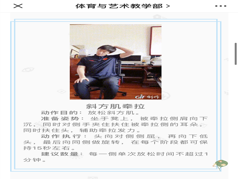 在這場沒有硝煙的戰爭中,提高自身免疫力是抵抗病毒的最好武器。長期居家,長時間使用電子產品,缺少活動,不僅影響身體健康,還容易引發負面的情緒。針對想鍛煉,缺乏場地器材的情況,體育與藝術教學部的老師們,精心制作了一系列居家鍛煉視頻,設計出了一套合理的鍛煉指南。該系列視頻包含了體能素質訓練、肌肉放松拉伸訓練、太極拳步伐、體育舞蹈等。現已在體育與藝術教學部公眾號(微信公眾號搜索體育與藝術教學部即可關注)上發布推廣,歡迎廣大師生閱讀參考。