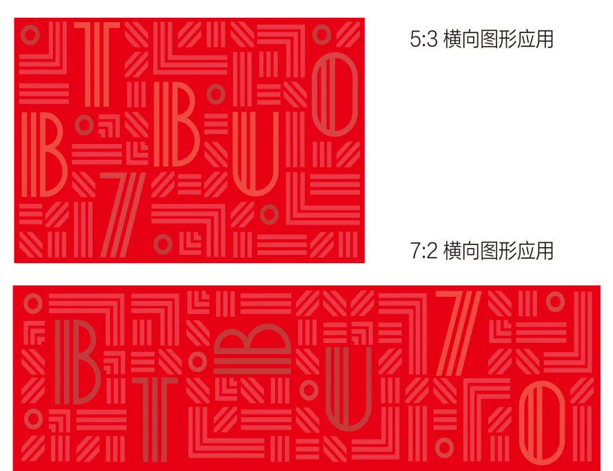 建校70周年VIS系統共分為兩部分,第一部分為基本標識系統,包含基本標識及釋義、標準色、標準字日、表示標準字日組合、表示規范植入、標識使用規范、標識延伸形象、輔助應用示例。輔助圖形使用 B、T、B、U、7、0 為圖形主體,再將北工商校園的鳥瞰圖抽象成幾何形,并通過粗等線形式讓其風格統一,運用散點式的排列方法形成完整的輔助圖形。該圖形主要作為配合標識的背景而使用。第二部分為應用系統,包含校慶會務辦公系統、校慶旗幟類、多媒體辦公系統、活動文創系列等。
