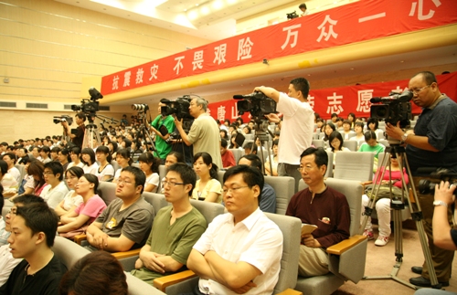6月13日,在我校舉行的抗震救災(zāi)英模事跡報告會吸引了首都各大媒體前來采訪報道。今晚北京電視臺新聞一頻道6:30將播出抗震救災(zāi)英模報告會新聞。