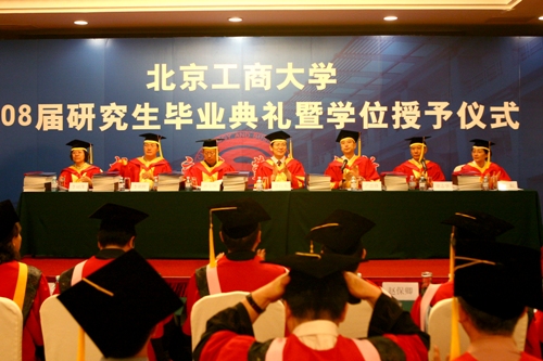 畢業典禮在雄壯的國歌聲中開始。謝志華副校長宣布了《北京工商大學關于2008年研究生準予畢業的決定以及授予碩士學位的決定》。李朝鮮副校長宣讀了《北京工商大學關于表彰2008年優秀碩士學位論文獲獎者的決定》和《北京工商大學關于表彰2008屆優秀碩士畢業生的決定》。校領導向獲得優秀畢業生稱號的同學頒發了榮譽證書并授學位。優秀畢業生李梓代表全體畢業生上臺發言,向母校表達了無限留戀和由衷感謝之情,并表示牢記母校“求真、立德、勤奮、創新”的校訓,畢業離校走向社會后,要心系民族命運、心系國家發展、心系人民福祉,繼續拼搏進取,努力奮斗,為母校爭光。導師代表張曉堂教授發言,祝賀研究生順利獲得碩士學位,實現了人生的一大跨越,希望今后能夠繼續追求理想、保持激情、誠信做人、堅強面對困難,爭取“百尺竿頭更進一步”,努力為國家建設作貢獻。畢業生代表向來自各院系的導師代表獻了花。
