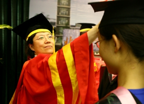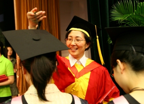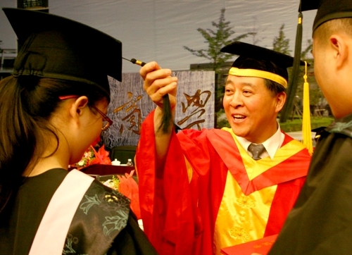當經濟學院貿經041班郝穎學士帽上的流蘇被校長譚向勇從右邊撥到左邊的那一刻起,苦讀了四年的2008屆畢業生就完成了人生中一個重要的里程,喜悅和祝福交織,臨別的眷戀和師長的叮囑同在。隨后,校領導孫堯東、譚向勇、盧思鋒、張德玉、孫寶國、謝志華、李朝鮮、王尚忠、張耘、李麗萍和各院系領導為參加畢業典禮的每一位畢業生扶蘇并頒發畢業證書。這是2008屆畢業典禮上最令畢業生們興奮的時刻。