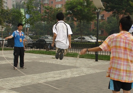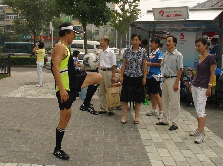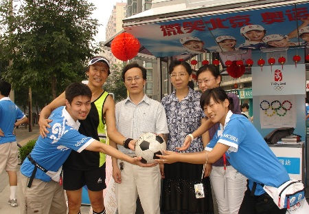 到達(dá)第三站——增光家苑站點(diǎn)時(shí),正值站點(diǎn)舉辦“傳遞奧運(yùn)精神 傳承體育文化”的趣味體育活動(dòng)。顛球、踢毽子、跳皮筋兒、抖空竹……居民們紛紛參與進(jìn)來,展露出自己的絕活兒。志愿者們還接待了一位年逾花甲的足球愛好者。老人家特地帶來了寫滿簽名和留言的足球,據(jù)老人介紹,這個(gè)足球是2001年中國(guó)足球沖出亞洲進(jìn)入世界杯時(shí)自己珍藏的,到現(xiàn)在已有七年之久。老人還專門表演了顛球、頂球的絕技,贏得了在場(chǎng)市民和志愿者們的高聲歡呼。