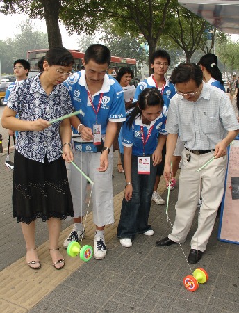 領(lǐng)導(dǎo)們興致勃勃的參觀了志愿者們親手設(shè)計(jì)、布置的服務(wù)崗?fù)ぃ⒂H身體驗(yàn)了一把抖空竹的絕活兒,將現(xiàn)場(chǎng)氣氛推向高潮。