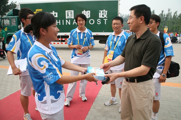 下午三點,王副校長一行到達奧運村,首先前往歡迎中心和訪客中心慰問了交通信息臺的志愿者,王副校長與志愿者們熱情握手。隨后,王副校長經過國際區,在運動員班車站慰問了在崗的三名志愿者并親手將防曬霜贈與她們。當看到被太陽曬得膚色黝黑的志愿者時,王副校長親切地說:“你們辛苦了,我來的次數很少,沒法替你們站崗。”他還囑咐志愿者有什么需要盡