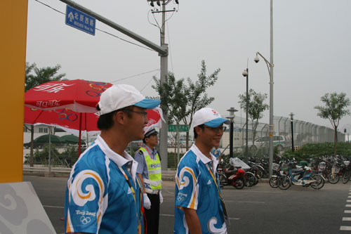 位于四號門的NOC停車場路口,車輛眾多,為交通管理帶來了壓力。當提及因為要堅守崗位而不能觀看開幕式的問題時,我校志愿者唐楊斌爽朗的笑著說:“堅守崗位是志愿者的責任。”簡單的回答卻透露出我校志愿者為奧運服務的堅定信念。志愿者們表示,雖然沒有觀看到奧運開幕式,但是卻沒有遺憾,因為大家已經在崗位上參與了奧運,保證了奧運村的交通順暢,這是志愿者們最大的快樂。