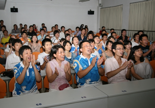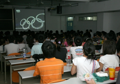 為了確保暑期留校學生、志愿者以及因工作需要堅守在工作崗位上的師生員工能夠及時收看奧運會開幕式電視轉播,8月8日,我校阜成路東、西校區共開放十間教室,同步轉播奧運開幕式,觀賽學生、教職工人數將近2000人。