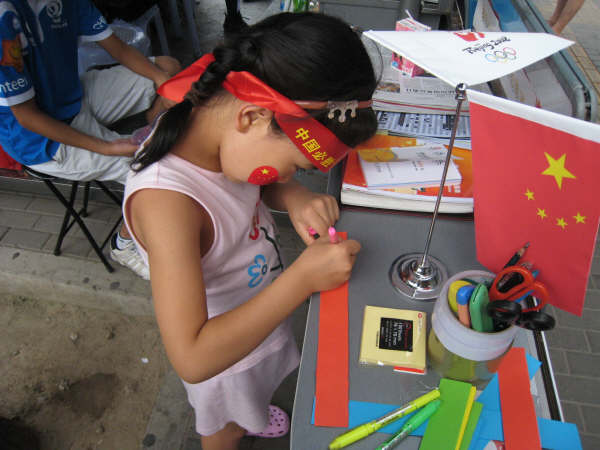 根據(jù)以往問路記錄仔細(xì)認(rèn)識(shí)地圖,挑選精品報(bào)紙制作剪報(bào),編排繪制“奧運(yùn)用語大家說”的中英文展板,制作奧運(yùn)首日祈愿展板……緊張的準(zhǔn)備工作只為這每一天服務(wù)的精彩。“我服務(wù),我快樂”此時(shí)此刻此種奧運(yùn)服務(wù)的精神正被我們這群大學(xué)生驕傲的充滿活力的展示著。陽光照射在我們身上,映著藍(lán)光流動(dòng)跳耀,仿佛這夏日驕陽都在為我們忙碌的身影喝彩,為北京奧運(yùn)喝彩。