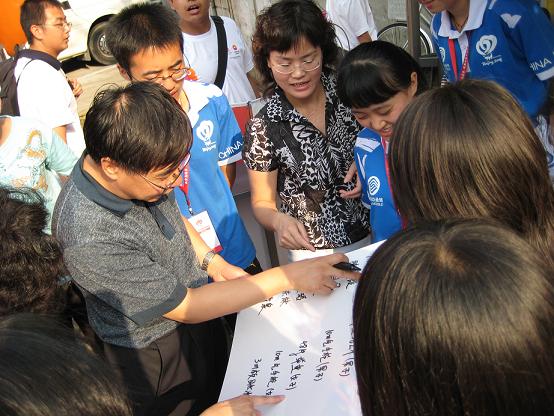 楊有紅院長、趙保卿書記以及隨行的老師都很積極的參加了各志愿者站點舉辦的活動——奧運知識問答,并獲得了笑臉掛飾獎品。