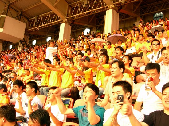 由于場(chǎng)內(nèi)高溫悶熱,比賽開始前,觀眾已汗流浹背,看臺(tái)上的觀眾服務(wù)志愿者幾次帶動(dòng)觀眾做人浪,效果都不理想。我校看臺(tái)互動(dòng)志愿者組成若干小方陣分布在看臺(tái)上,他們用夸張的肢體展示進(jìn)行人浪表演,吸引了周圍看臺(tái)上的觀眾,隨即拉拉隊(duì)特有的賽場(chǎng)氛圍撲面而來,高亢、熱情的助威吶喊響徹全場(chǎng),高漲沸騰的人浪翻滾而來,掀起了一陣又一陣的助威高潮。