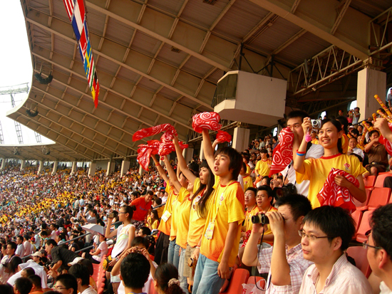 兩場(chǎng)比賽持續(xù)近四個(gè)小時(shí),我校看臺(tái)互動(dòng)指揮志愿者始終保持高度的熱情,他們激昂、動(dòng)感的肢體展示,熱情洋溢的青春笑臉,獲得了看臺(tái)觀眾的陣陣喝彩,更緩解了觀眾觀賽期間的間歇疲勞,不少觀眾更是以這些互動(dòng)志愿者表演為背景,攝影留念。我校看臺(tái)互動(dòng)指揮志愿者為奧運(yùn)足球賽場(chǎng)增添了魅力,向中外有人展示了中國(guó)人民熱情好客的美好形象。