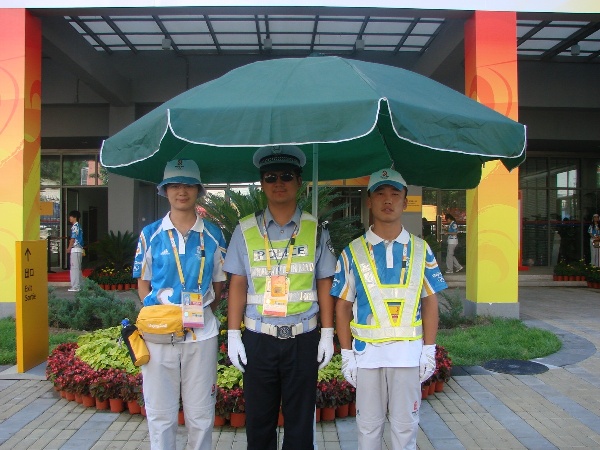 在所有業(yè)務(wù)口中,交通業(yè)務(wù)口志愿者服務(wù)的環(huán)境是比較艱苦的。每天最早來(lái)到場(chǎng)館的志愿者是他們,最晚離開(kāi)場(chǎng)館的志愿者也是他們。在戶外工作難免會(huì)遇到惡劣天氣,但是盡管現(xiàn)在烈日炎炎,在遮陽(yáng)傘下,我們看到的依然是三張熱情的笑臉。也許這就是志愿者最可愛(ài)的地方吧,也許沒(méi)有空調(diào),但是他們有微笑;也許看不到比賽,但是通過(guò)他們的服務(wù)他們能讓比賽進(jìn)行得更順利。