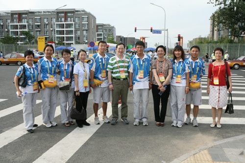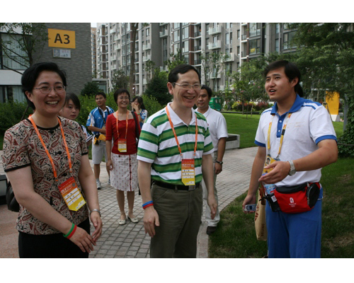 校領導一行慰問了在奧運村服務的志愿者和服務生,詳細地了解了他們的工作情況。校領導鼓勵他們繼續認真服務,并為他們戴上了象征著志愿服務精神的微笑圈。