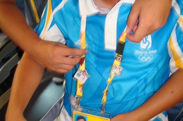 除了有獎知識競答,帶隊老師還組織了奧運紀念章合影交流活動。志愿者戴著的各式各樣的紀念章,受贈于不同國家不同項目,都是努力為奧運服務(wù)得到的真心回報。每一個紀念章背后都有屬于它自己的故事,或是暴雨中送運動員及時上班車,運動員沒被淋,但志愿者卻已然濕透全身;或是烈日下為國際友人指路攔車,去哪里怎么走,購物旅游,想盡辦法使得外地志愿者硬是成了北京通;或是在最無聊也最熱的站崗中依然保持微笑,朝往來的運動員微笑地打招呼,在酷暑中送出一份清涼。