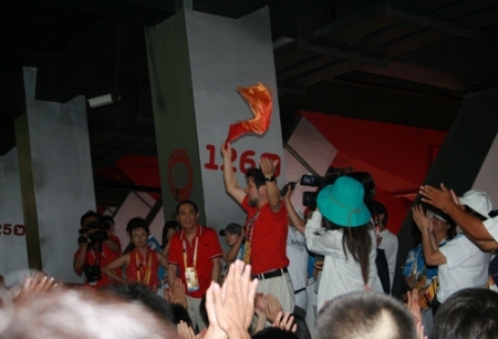 16點,奧運會開閉幕式總導演張藝謀、副總導演陳維亞來到互動指揮志愿者臨時“駐地”,為志愿者做決戰(zhàn)動員。張藝謀談到不能用對開幕式的期待來看待閉幕式,閉幕式核心內容就是告別,表達留戀之情,注意的并不是獨創(chuàng)性,更注重的是運動員、裁判員、官員們、志愿者、觀眾一起享受歡樂的奧林匹克時光,營造出普天同慶的效果。雖然節(jié)目精彩程度和開幕式不可相比,但是觀眾席上的熱烈氣氛是要保證的,這就給互動指揮工作帶來一定難度,任務艱巨。奧林匹克的圣火雖然熄滅了,但是在每一個人心中的火炬將繼續(xù)燃燒這一聲音需要你們帶領全體觀眾向全世界人民傳遞。特別要做好閉幕式中三個亮點的全場互動,也是閉幕式的核心內容。陳維亞導演更是結合夸張的肢體展示向全體互動指揮志愿者解釋了閉幕式三個亮點的重要工作。