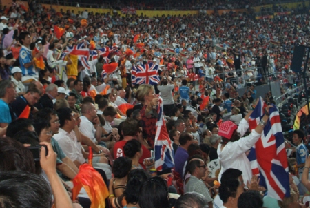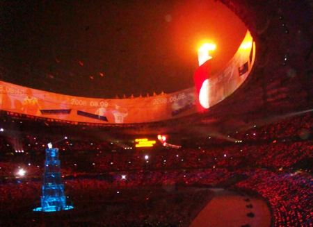 20點,奧運會閉幕式正式開始,看臺互動指揮志愿者的表演時刻到來,此時的國家體育場歌聲飛揚、笑語不斷,洋溢著熱烈喜慶的氣氛。互動指揮志愿者認真的執(zhí)行著總指揮的命令,一刻不敢怠慢。他們面帶微笑、顫動性的語言、夸張的動作,吸引了觀眾們的目光,場上高潮迭起,飄逸的祥云紗在場內飛舞,繽紛的彩紙漫天飛揚,歌聲、笑聲、歡呼聲響徹云宵,國家體育場成了歡樂的海洋。“今晚奧林匹克的圣火不會熄滅”,奧運圣火繼續(xù)在每一個人心中燃燒。