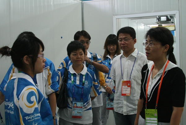 呂素香首先到達殘疾運動員分級中心,探望我校在這里辛勤工作的44名志愿者。在與志愿者們的交流中,呂素香談到,同學們接受培訓的時間短,分級工作的任務艱巨,希望同學們能繼承和發揚奧運會志愿者的奉獻精神,做好殘奧會的服務。分級中心經理孔雷、等領導親切接待了呂素香一行的來訪,并對我校志愿者的高素質和認真負責的工作態度給予了充分肯定。自8月28日以來,分級工作進入最緊張階段,志愿者們每日上崗12小時以上,但從不叫苦喊累。昨夜王曉峰等5名同學加班到凌晨12點,簡單休息之后次日又繼續奮戰在工作崗位。