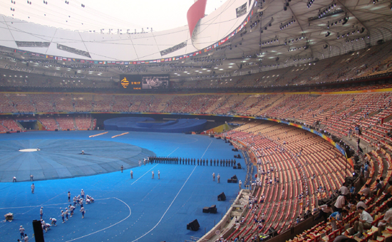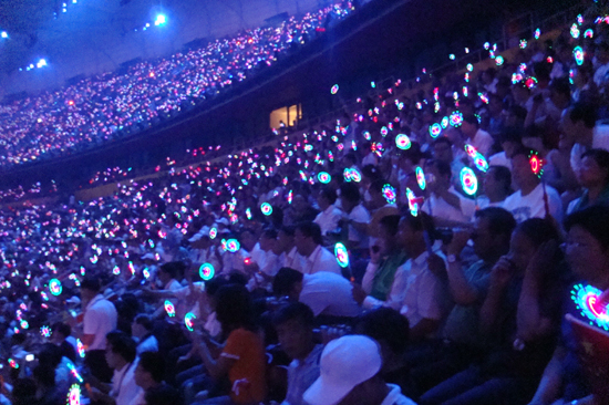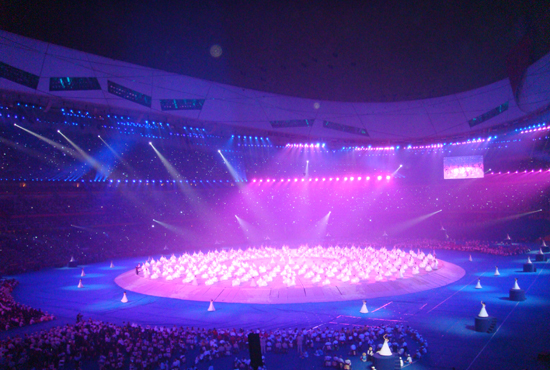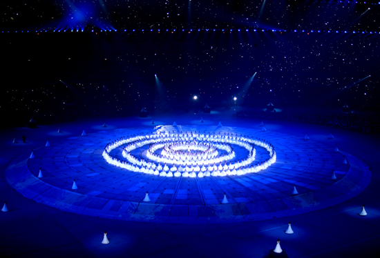 晚10點,文藝演出開始,互動志愿者們運用手中的道具以及身體語言與臺下的演員、運動員互相配合,使整場的儀式達到真正意義上的融合。舞臺上燈光閃耀,觀眾席上有志愿者手中道具組成的“燈海”片片。這種渾然一體的效果讓鳥巢里的氛圍變得神秘而又充滿了力量。志愿者們仔細的注意著場上人員動作的變化,認真的聽著音樂節奏的轉變,適時的變換動作以及手中的道具與演員們進行互動。志愿者們的歡呼聲,舞動的彩綢,璀璨的燈光,構成了動與靜的美好畫面,在場的每一個人都沉醉其中,都被這樣精彩的畫面所感染。