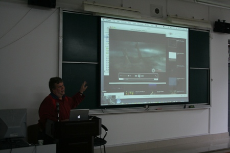Garman教授結合他個人參與制作的《后天》、《絕密飛行》、《荒島余生》、《時間機器》多部特效影片片段,為同學們詳細講解了電影中如何利用數字特效技術制作出云,雨,霧,爆炸,破碎,布料運動模擬等數字特效領域的前沿技術。在回答老師和學生提問的過程中他介紹了北美最前沿特效領域發展現狀以及視覺特效及視覺特效師在北美CG產業鏈中的重要作用, 分析了當前中國特效發展的現狀,未來的發展趨勢, 并對數字內容學院相關專業方向的學生在專業知識貯備、個人發展方向及職業規劃等方面進行了指導。Garman 教授風趣、幽默的語言和生動、有趣講解引得在場學生的陣陣掌聲。