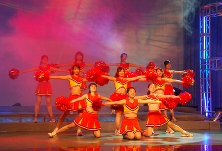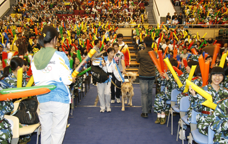 我國首位冬奧會冠軍楊揚在主席臺上同志愿者互動