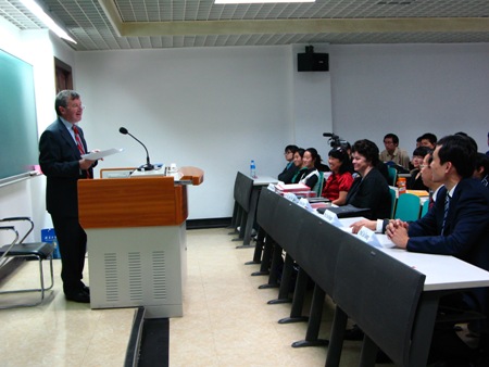 10月13日下午,愛爾蘭考克大學校長邁克爾· 墨菲教授和考克大學國際部主任露易思·托賓女士在我校良鄉校區文二樓203教室分別做了精彩的報告。我校副校長孫寶國教授主持報告會,外事辦主任羅朝能出席報告會。