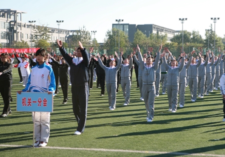 由各分工會組成的教職工代表隊進行了廣播體操比賽。看著平日站在講臺上的老師如今在操場上用十分標準的動作做著廣播體操,臺下的同學們爆發出了熱烈的掌聲。