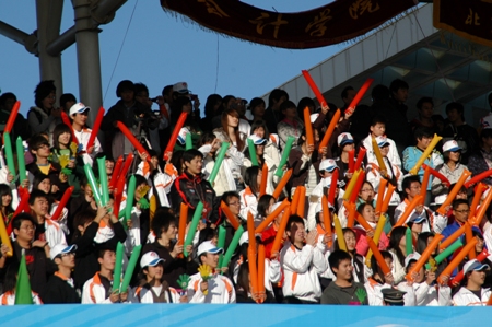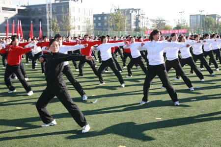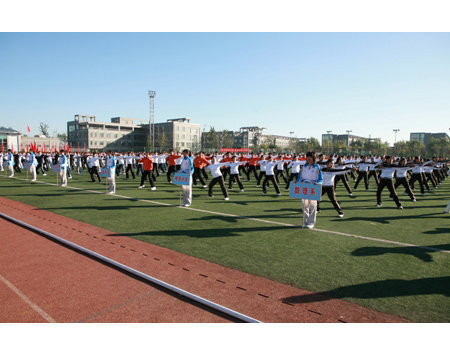 我校2007級的女生身著奧運五環顏色的服裝為在場觀眾帶來了精彩的健美操表演。她們活潑的動作和不時變換的隊形,充分的展現了我校學生朝氣蓬勃、積極向上的良好精神面貌。