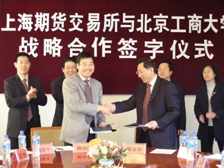 這份戰略合作備忘錄包括聘請證監會期貨部副主任彭俊衡、上海期貨交易所總經理楊邁軍、總經理助理褚玦海、上海期貨交易所發展研究中心鮑建平為北京工商大學兼職教授,并以北京工商大學證券期貨研究所為基礎,合作建立北京工商大學—上海期貨交易所期貨與金融衍生品研究中心,共同開展學術活動,共同培養期貨市場高端人才。