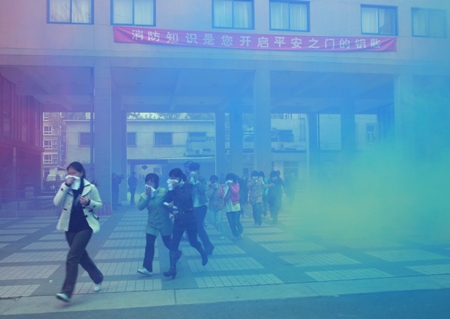 中午13:00,隨著學校黨委副書記、校防火安全委員會主任盧思鋒一聲令下,阜成路校區防火疏散演習正式開始。只見東區3號樓A、B座高層樓兩處煙霧點冒出滾滾濃煙,3號樓下形成一片煙霧區,警報器聲劃破靜靜的校園,住在3號樓內的化工學院、材料系、繼續教育學院、研究生部近200名新生,用毛巾捂著口鼻陸續從樓內疏散出來,并沖過煙霧區平安到達指定地點。